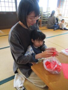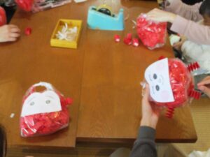赤いお花紙をみんなでくしゃくしゃにして袋に入れていきます。