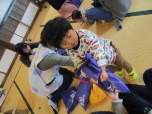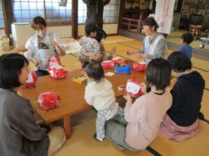 最後はお楽しみタイム❣ だるまさんのボックスからカラフルなリボン🎀の中から1つ選んで引っ張ると…すてきなお土産をゲット😊