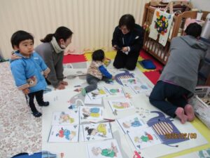 子どもたちはお母さんといっしょに、そのカードを探して手に取ります。