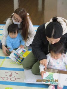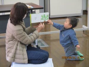読みかせが終わってから、ちょっぴり絵本と触れ合いました🤗 気になった絵本をそれぞれ手に取り、ママに読んでもらっていました。