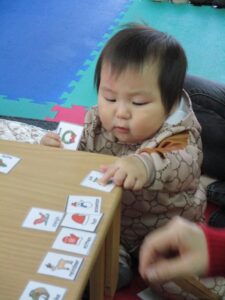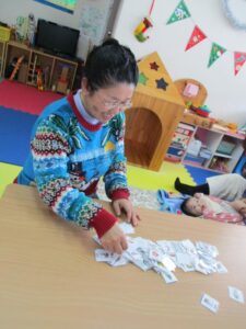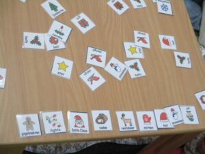 始めはおなじみの絵単語のカード取り💳 今回はクリスマスの絵カードを机いっぱいに広げていきます🎄